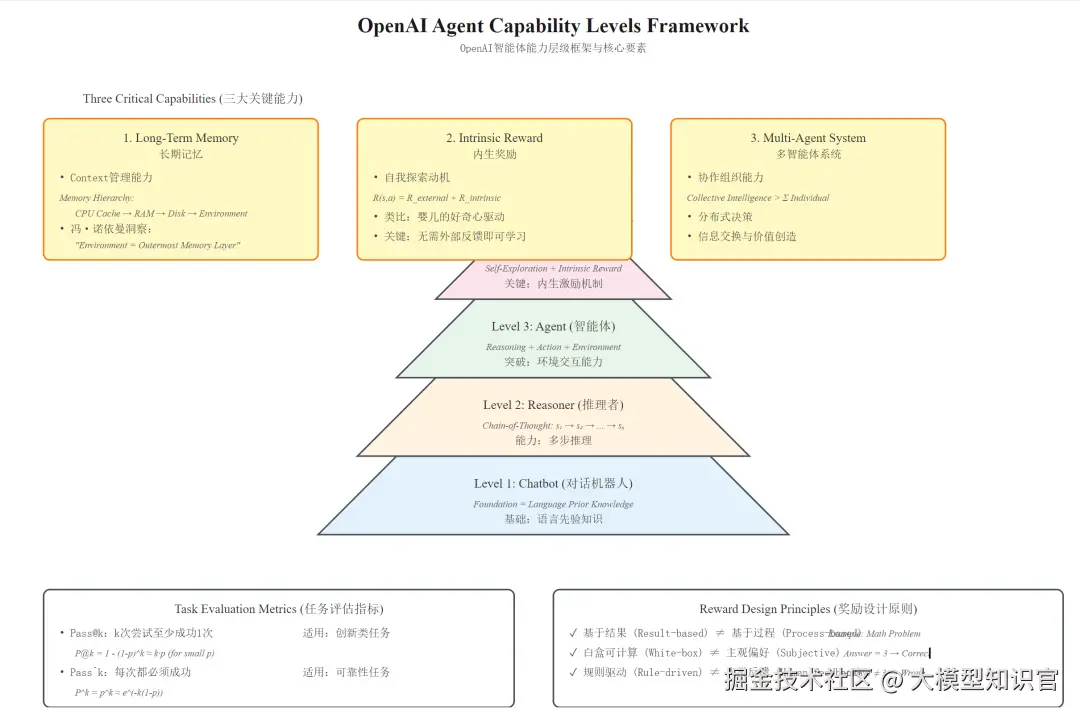 OpenAI将AI能力分为五级(Chatbot → Reasoner → Agent → Innovator → Organizer)。从Agent(Level 3)向更高层级发展,需要突破三大关键能力:长期记忆、内生奖励、多智能体协作。