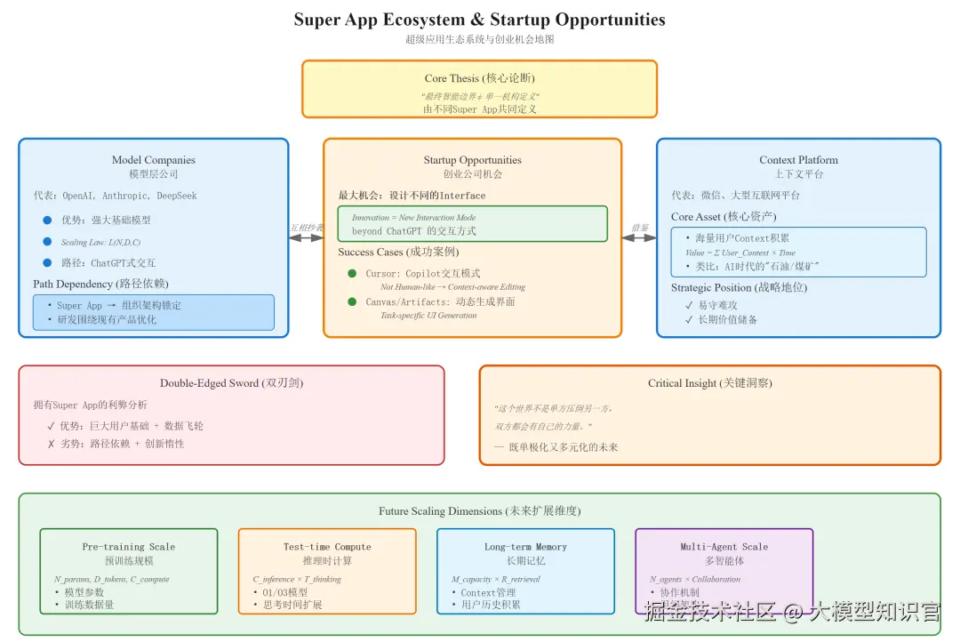- • 核心挑战: 要找到那个和ChatGPT形态很不一样的Super App,因为一旦公司有了Super App,所有事都会围绕它重构。