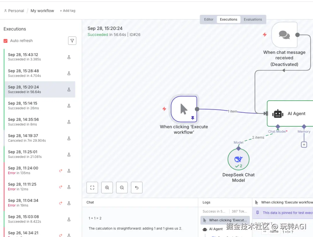 n8n会在executions的tab里面记录每一次执行的快照信息和执行的每一步骤的日志