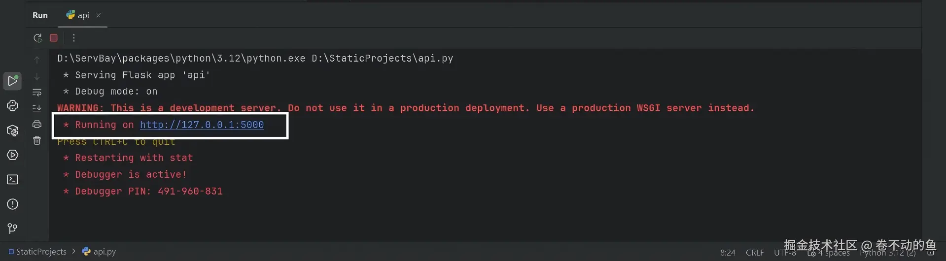 等终端显示 Running on http://127.0.0.1:5000,说明接口服务已经成功启动。