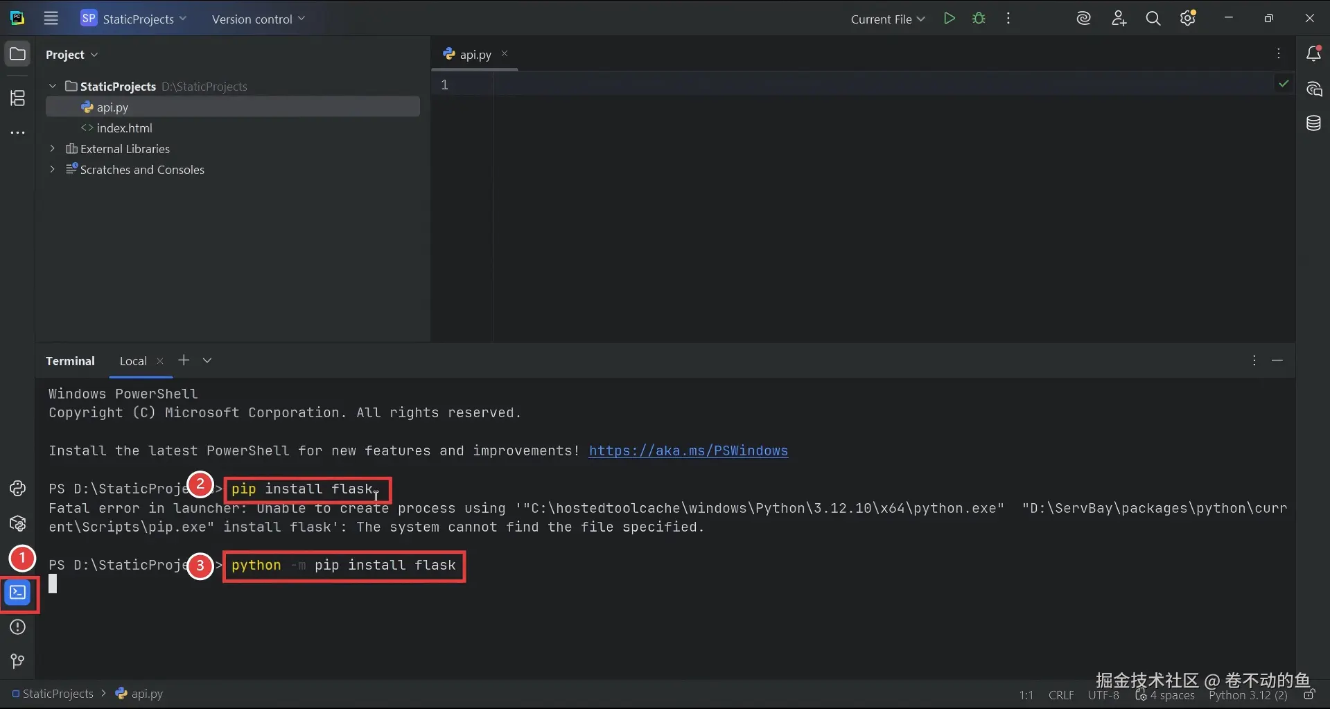 打开底部的 Terminal 终端,输入用来安装接口开发必备的 Flask 库命令。