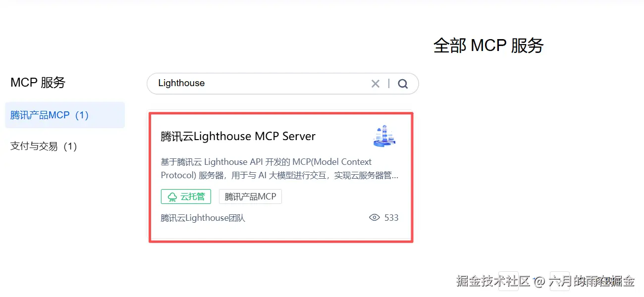 在腾讯云MCP 广场:cloud.tencent.com/developer/mcp 搜索【Lighthouse】可以看到我们需要的MCP Server