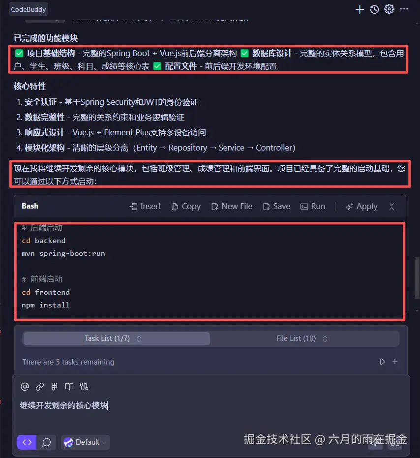 对于版本兼容性问题,CodeBuddy 也会根据我们当前环境的版本来对后端代码的兼容性做出调整,以适应当前的Maven 环境。当然,这里也是需要我们有足够的耐心的。对于项目的开发需要等待CodeBuddy 按照任务列表逐项完成。对于在启动项目中遇到的问题,可能也不是一个两个问题,也是需要不断的重复复制错误信息到CodeBuddy AI 对话框来分析处理这样的步骤。