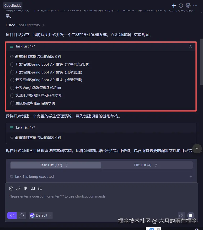 那么下面我们就可以发送我们的需求来让 CodeBuddy IDE 帮助我们实现我们的学生管理系统了。在接收到我们的需求后,CodeBuddy 会自动根据我们的需求内容分析并制定项目规划,生成任务列表