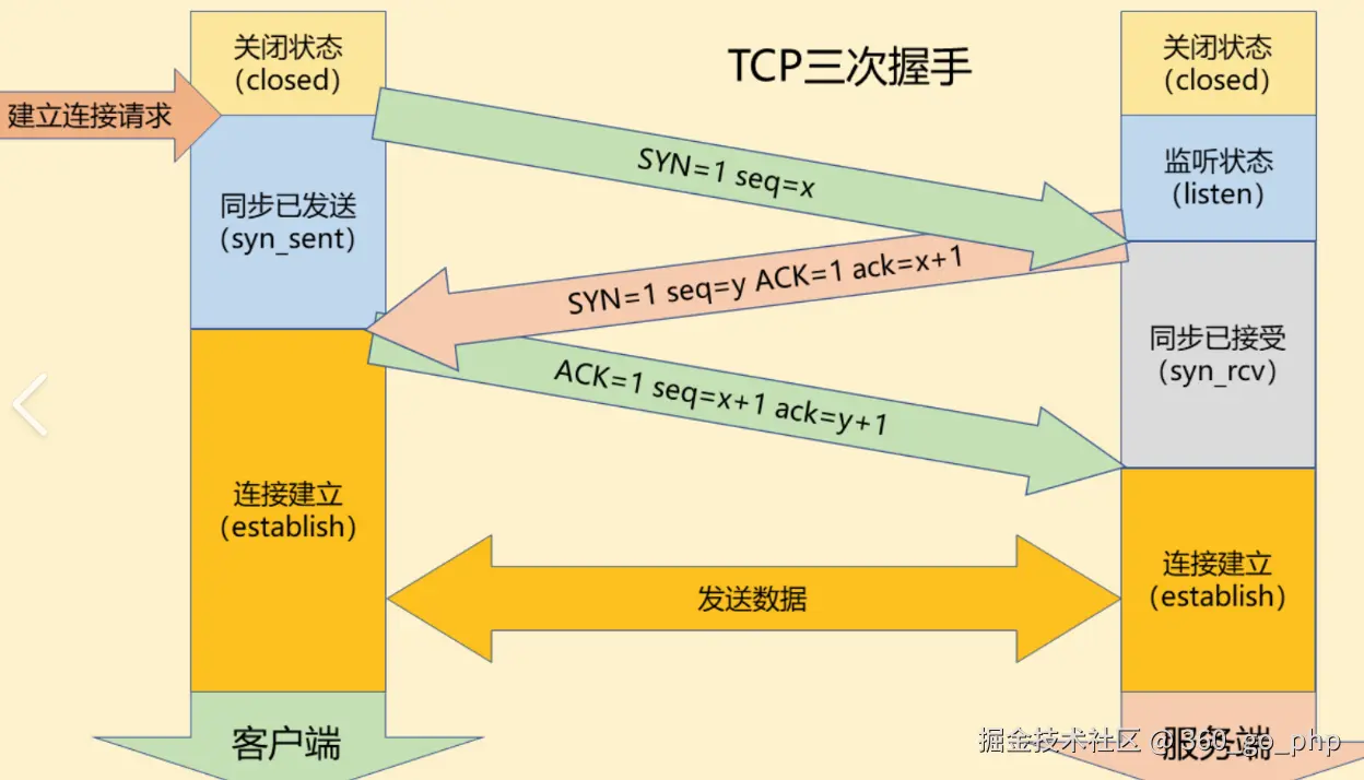 - 建立连接:浏览器与服务器建立 TCP 连接(通过三次握手)。