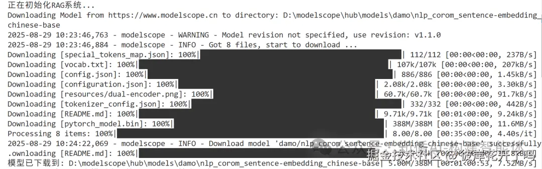 正在初始化RAG系统... Downloading Model from www.modelscope.cn to directory: D:\modelscope\hub\models\damo\nlp_corom_sentence-embedding_chinese-base 2025-08-29 15:09:10,402 - modelscope - WARNING - Model revision not specified, use revision: v1.1.0 模型已下载到: D:\modelscope\hub\models\damo\nlp_corom_sentence-embedding_chinese-base 问题:公司的年假政策是怎样的? 答案:根据公司规章制度,年假政策如下: