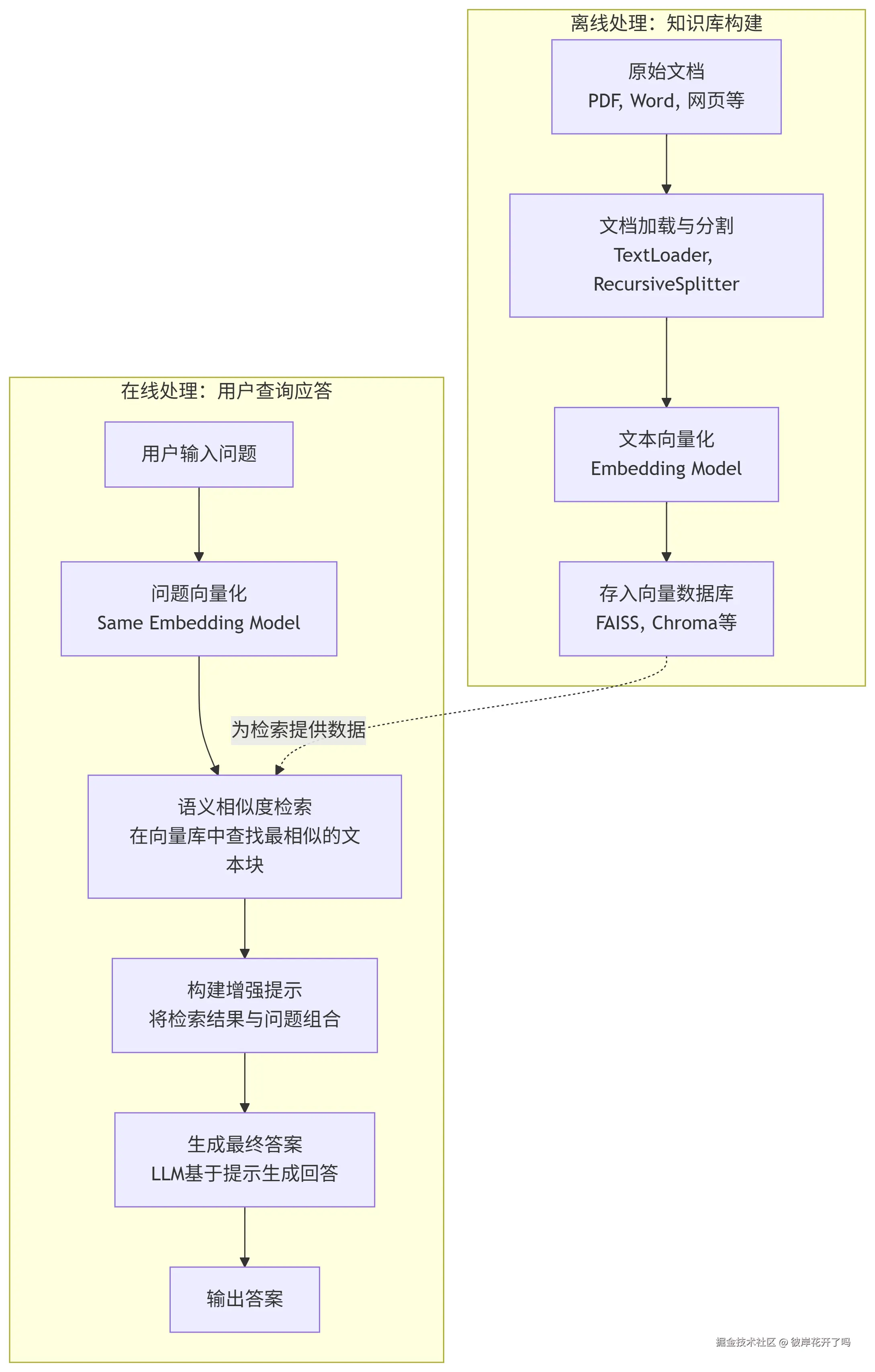 上述流程可以清晰地分为两个主要阶段:离线处理(知识库构建)和在线处理(用户查询应答)。