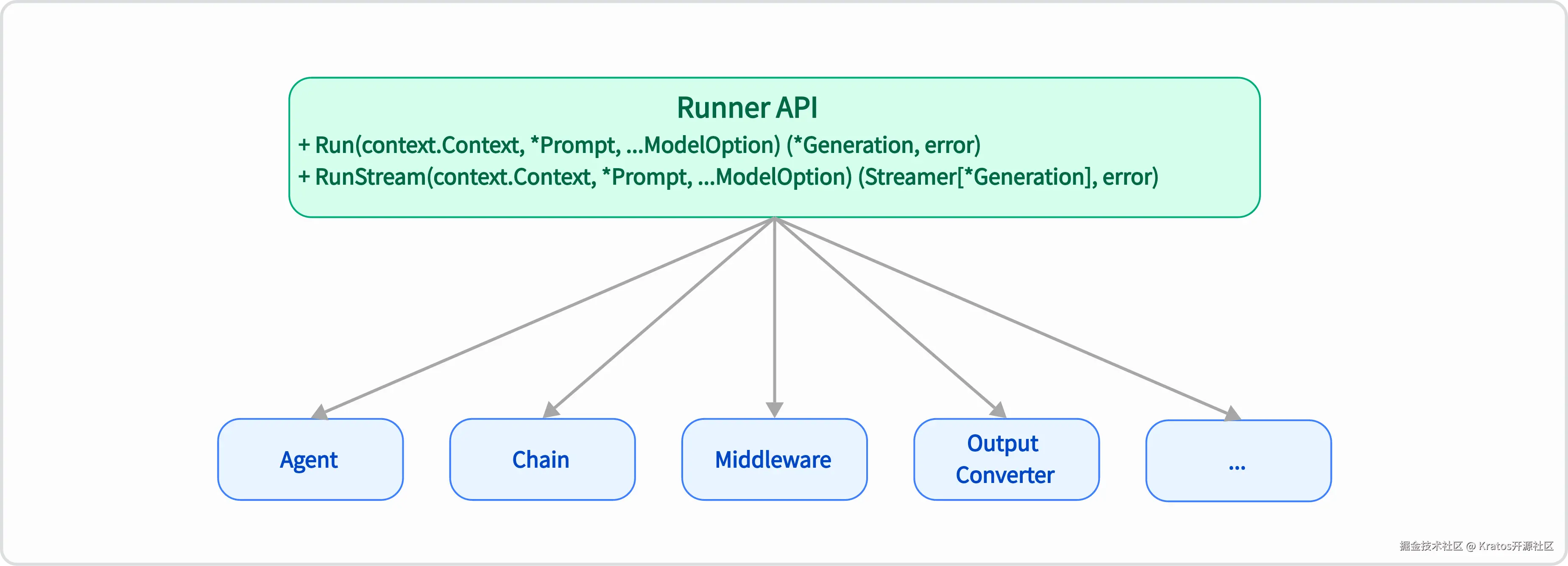 其设计旨在提供一个统一的执行范式,通过 Run 和 RunStream 方法,实现了框架内各种功能模块的解耦、标准化和高度可组合性。Agent、Chain、ModelProvider 等组件都实现了此接口,从而统一了它们的执行逻辑,使得不同组件能够像乐高积木一样灵活组合,构建复杂的 AI Agent。