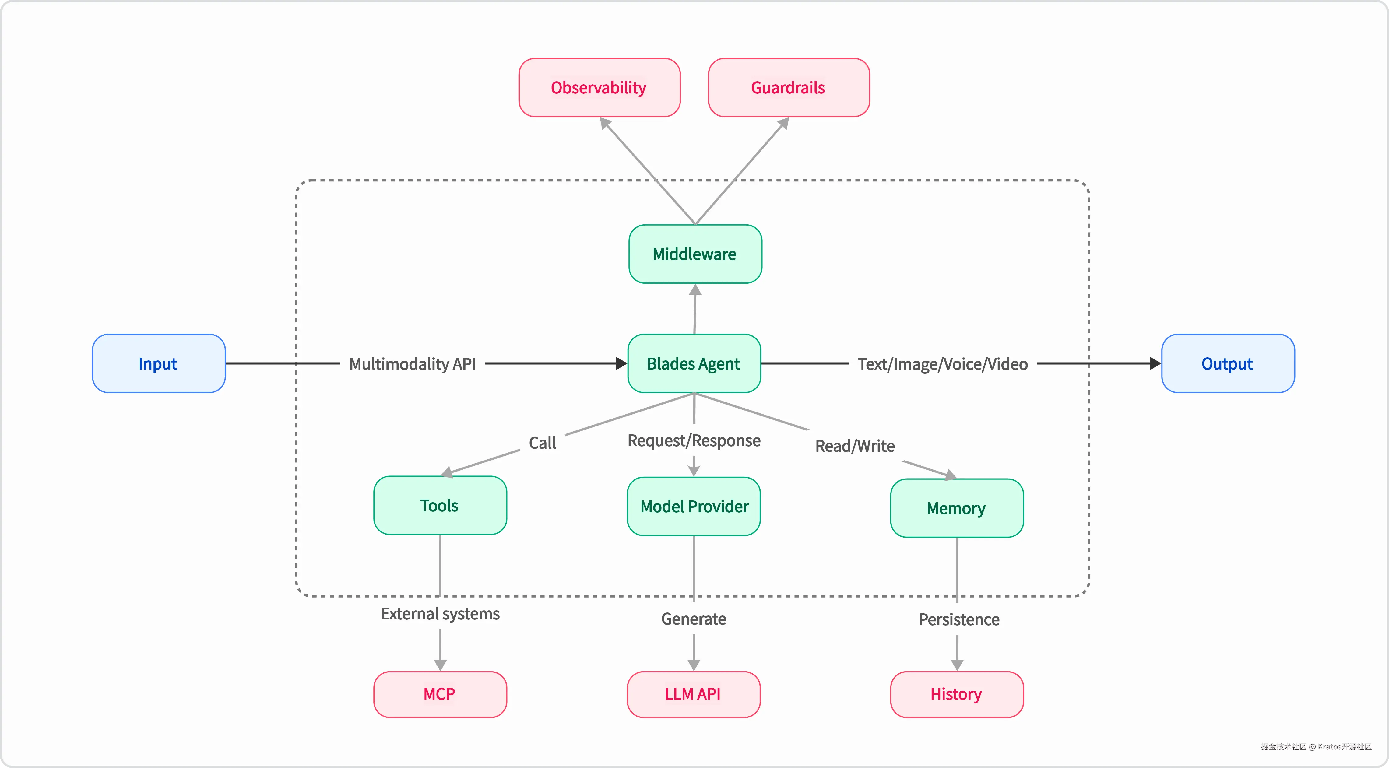- 中间件生态:借鉴 Kratos 的中间件设计理念,无论是 Observability、Guardrails,都可以方便的集成到 AI Agent。