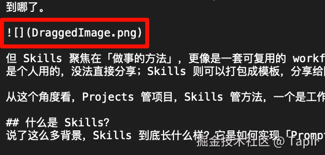接下来我们创建一个实用的 Skill:上传图床助手 :平时在写完技术文章之后,发布的过程其实挺麻烦的,因为我经常使用 Ulysses 写作,导出为 Markdown 后,很多图片引用实际是在本地的,如果要发布一般还是要上传到图床上才能直接用。另外,我引用的一些图片的格式很多地方不支持,需要统一成 png 来上传。