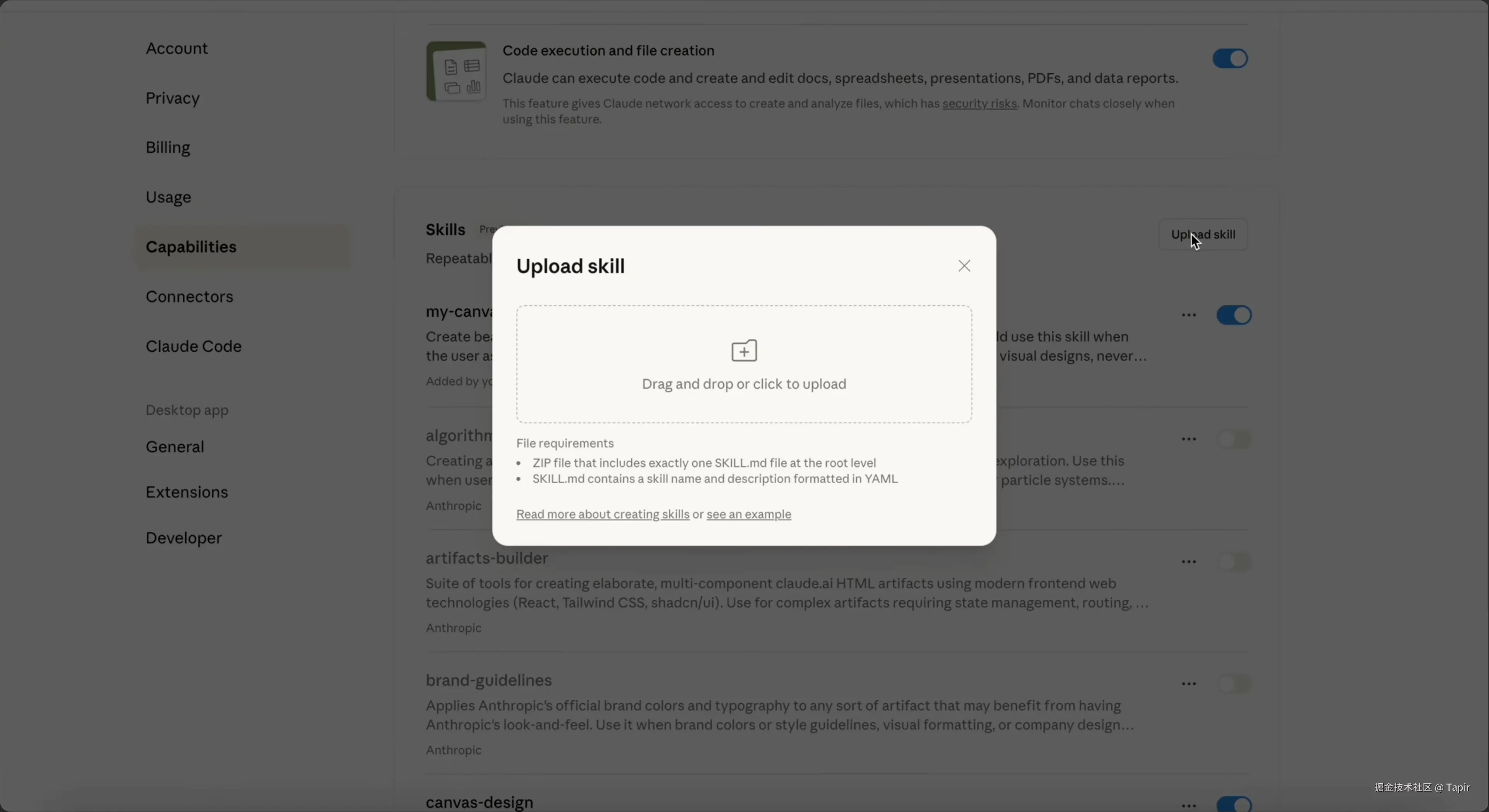 Anthropic 在 Claude 上提供了一些预制的技能可以开启,也支持用户自己上传 zip 包来使用: