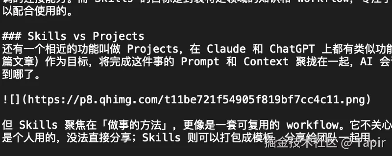 但 Skills 聚焦在「做事的方法」,更像是一套可复用的 workflow。它不关心你在做哪个项目,而是帮你保持统一的做事风格或标准。而且 Projects 通常是个人用的,没法直接分享;Skills 则可以打包成模板,分享给团队一起用。