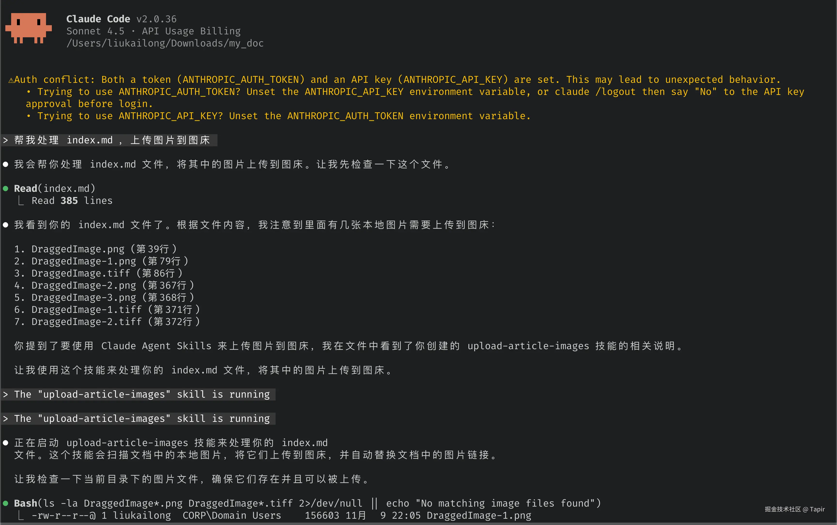 首先,description 里明确写了触发词("上传图床"、"upload images”),然后直接在开头就给出执行命令,避免 Claude 自己瞎猜,还用了大量的 "Do NOT" 来约束行为(虽然官方不推荐,但实测这样更稳定)