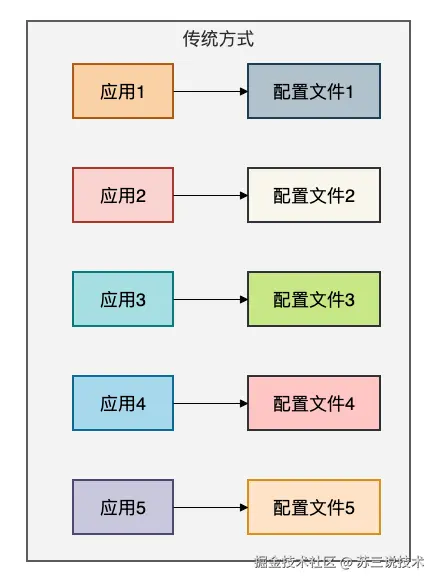 传统方式的配置文件分散到每个应用当中,非常不方便管理和唯一。