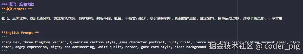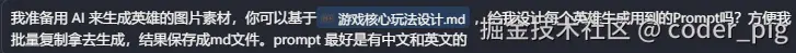 😄 模型训练好了,接着就用它来生成英雄和怪物的素材,先是英雄,五类 (肉盾、战士、射手、法师、辅助),每类9个,共计 45 个,自己一个个想 Prompt,整到猴年马月,直接让 AI 生成每个英雄的 Prompt: