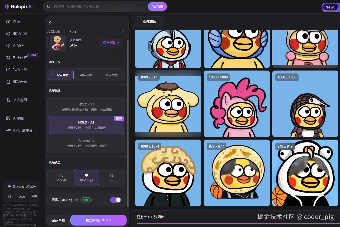选出100张含 "坤" 量最高的图片,打开 Holopix AI 官网,点击左侧 "模型定制" → "开始模型训练",填下模型名称,选下训练主题/模型,训练强度选低 (素材少的可以选中或者高)
