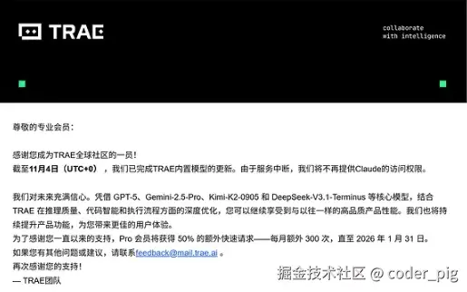 😄 上周 Cursor 2.0 刚发布了对标「Trae SOLO」的 "Agents" 模式,前天 Trae 国际版就宣布 Claude 断供: