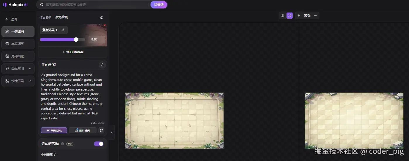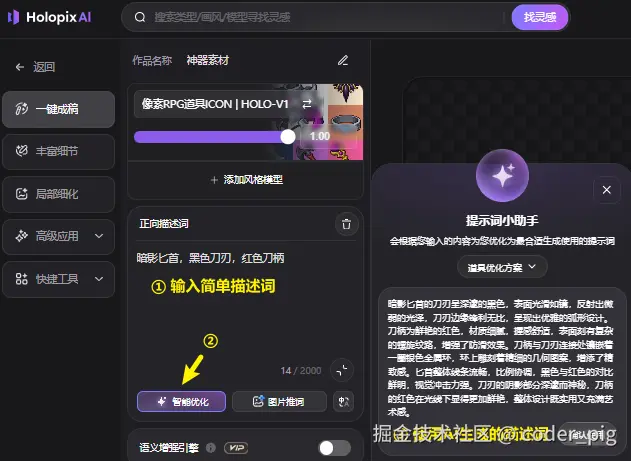 😐 可以看到批量生成的 Prompt 比较粗糙,想要 "更精细" 的生成效果,可以使用 Holopix 的 "智能优化",只需输入简单的 Prompt,AI 就能生成丰富的 "词元":