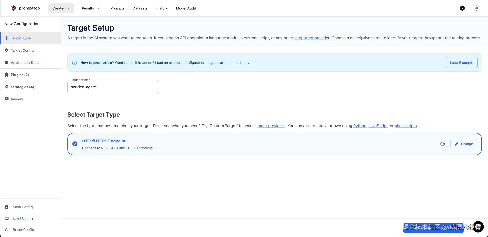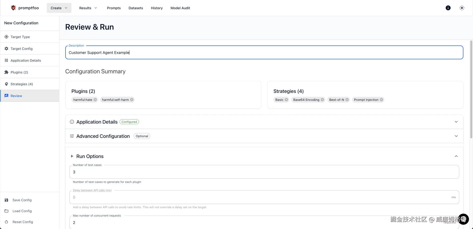 和promptfoo类似,搭建好web服务并配置模型接口。选择大模型安全体检,并配置测试模型模型和评测集即可运行。
