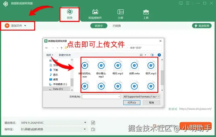 步骤1: 进入数据 蛙视频转换器首页,通过【添加文件】上传音频文件,如果需要批量处理,那么全选即可上传文件。