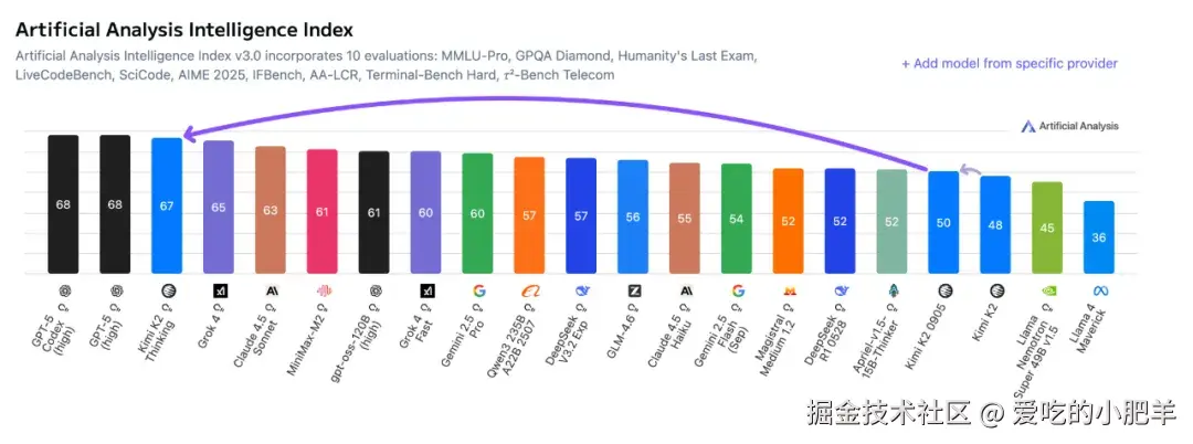 这一成绩使其领先于所有的其他开源模型,包括最近发布的MiniMax-M2和DeepSeek-V3.2-Exp,仅次于GPT-5。