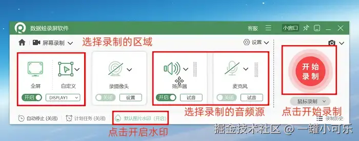 步骤2:接着先根据录制需求选定适配的区域范围与音频输入源,如果需要为视频添加专属标识,可以直接进入 “水印设置” 界面,按需调整水印的位置、透明度或样式。等所有参数设置完毕后,点击界面上的 “录制” 按钮启动视频录制。