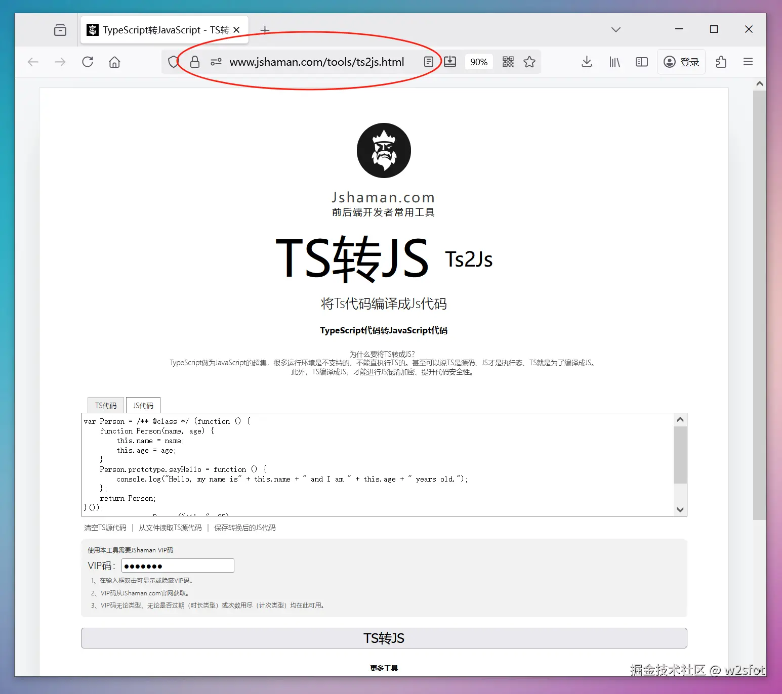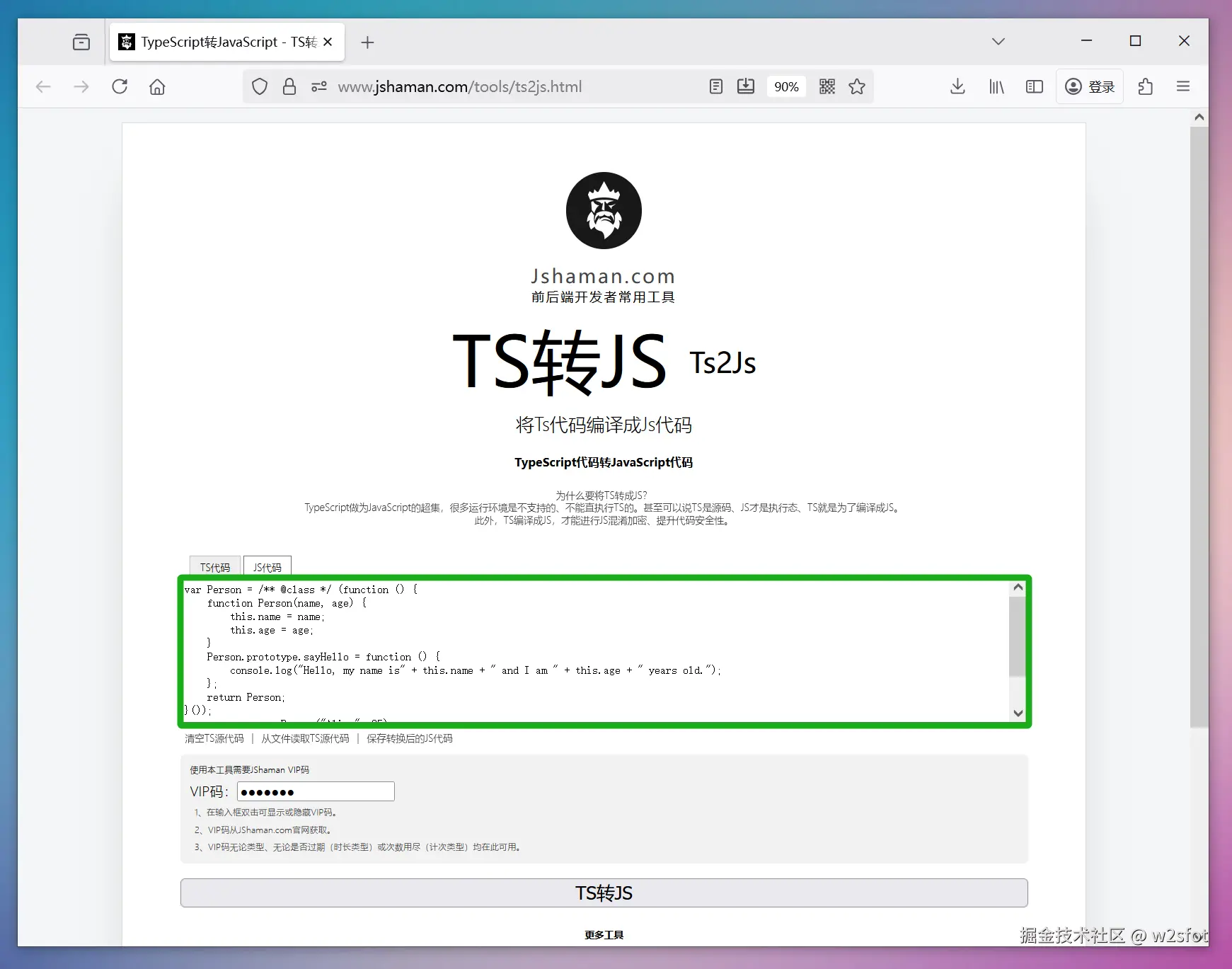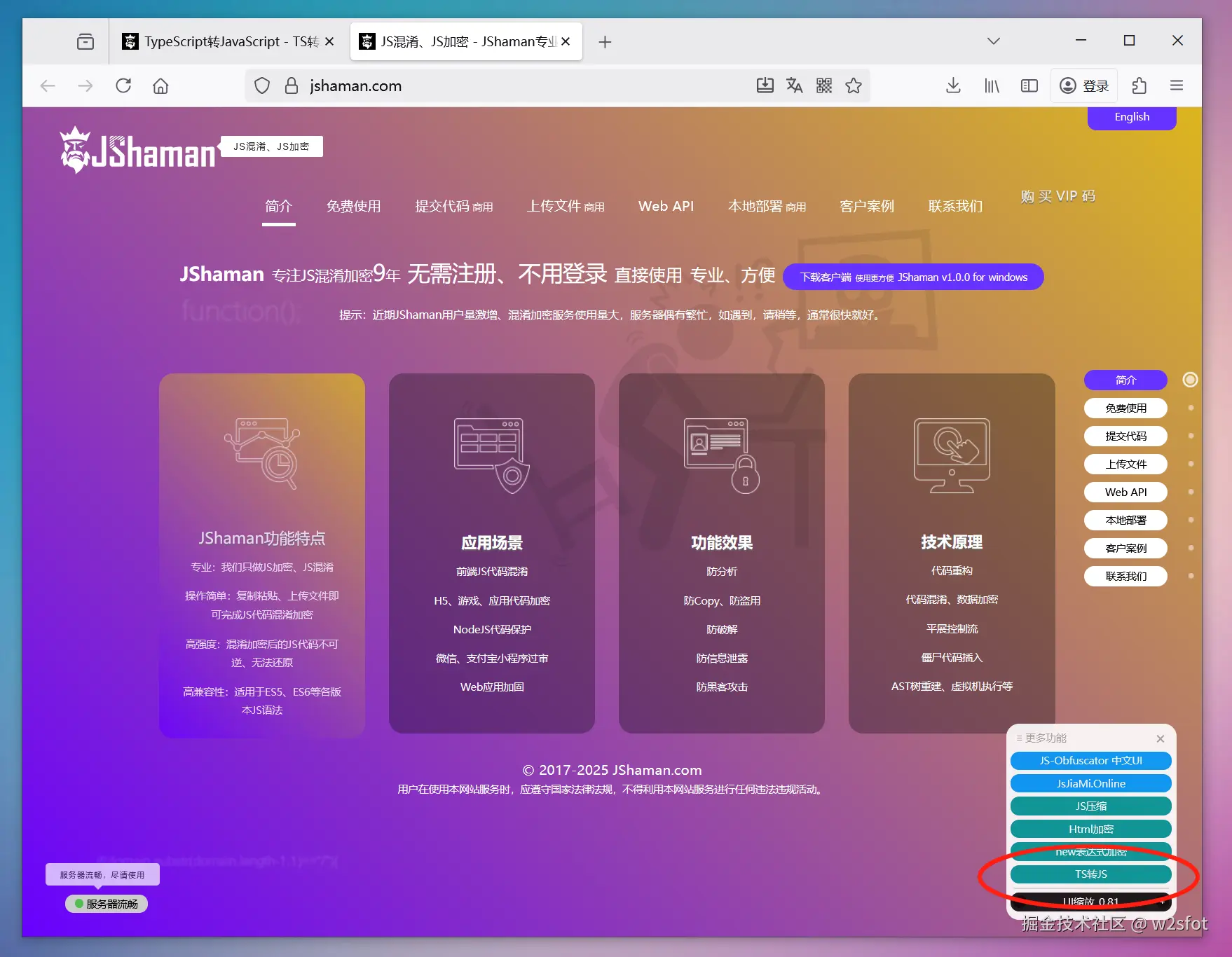 在线typescript编译成js(ts2js) w2sfot 2025-11-10 24 阅读1分钟 如何在线将typescript编译或转化成javascript?这也常称为ts2js操作。 可以使用JShaman的在线工具: 具体进入方式,先打开JShaman官网,点击右下角的“更多功能”: 在打开的菜单中选择“TS转JS”: 使用非常简单,输入typescript代码,点击转化,即可编译生成js代码: 编译生成的JS代码: