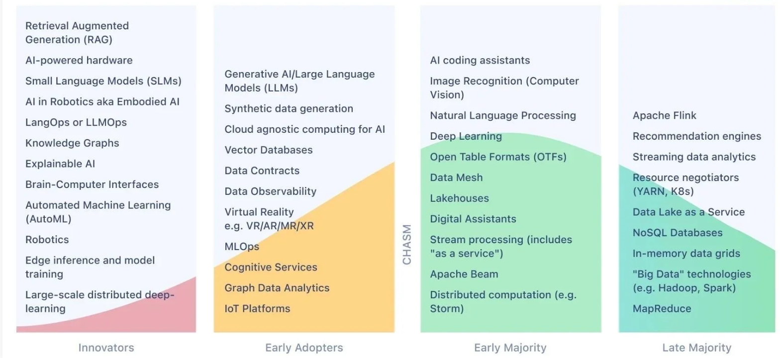 报告中的核心部分是 年度趋势图(Trends Graph),展示了不同技术从“创新者阶段”到“早期采用者”、“早期大众”的演进路径。