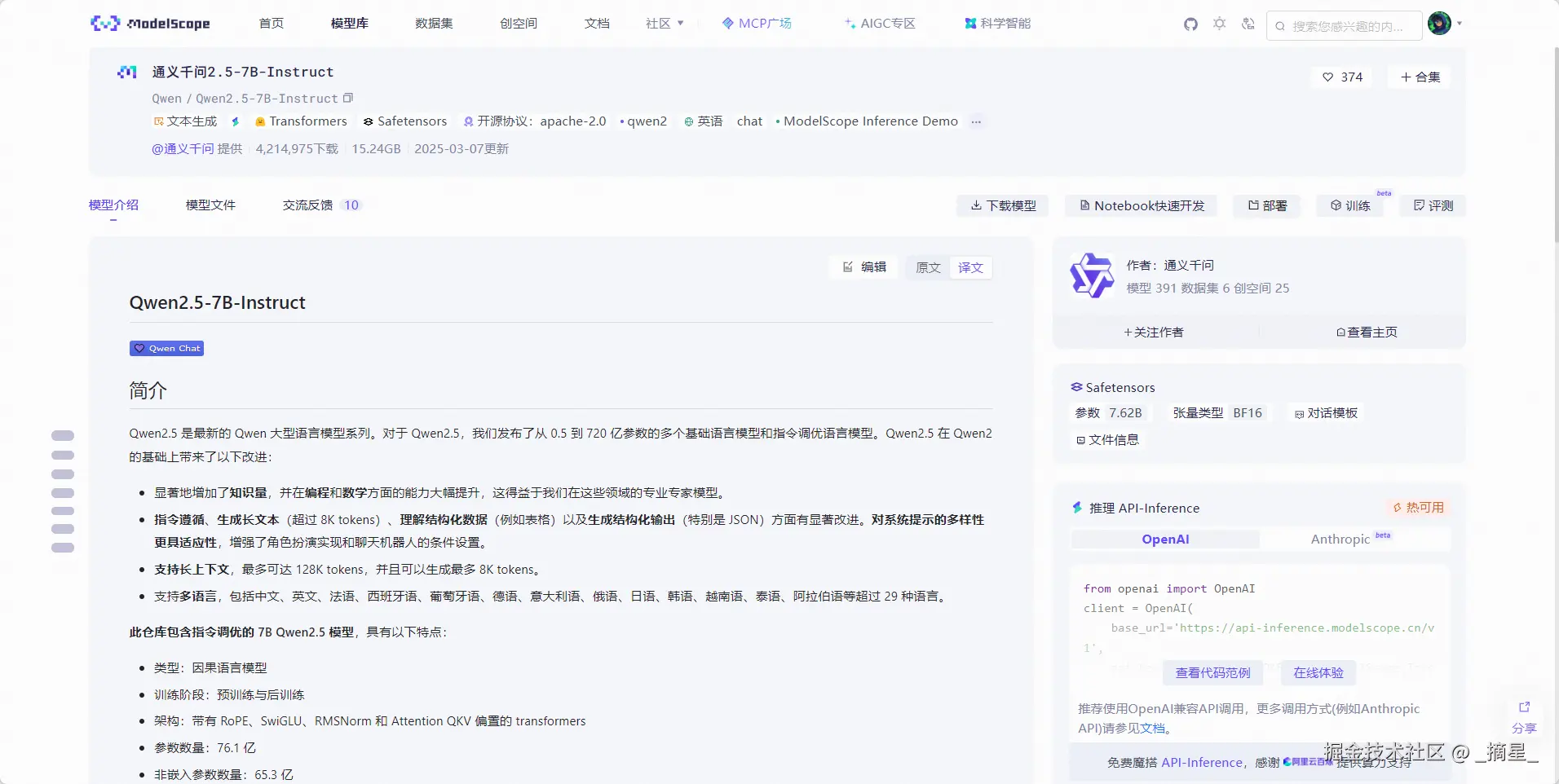 在魔搭社区模型库中找到通义千问2.5-7B-Instruct并进入详情