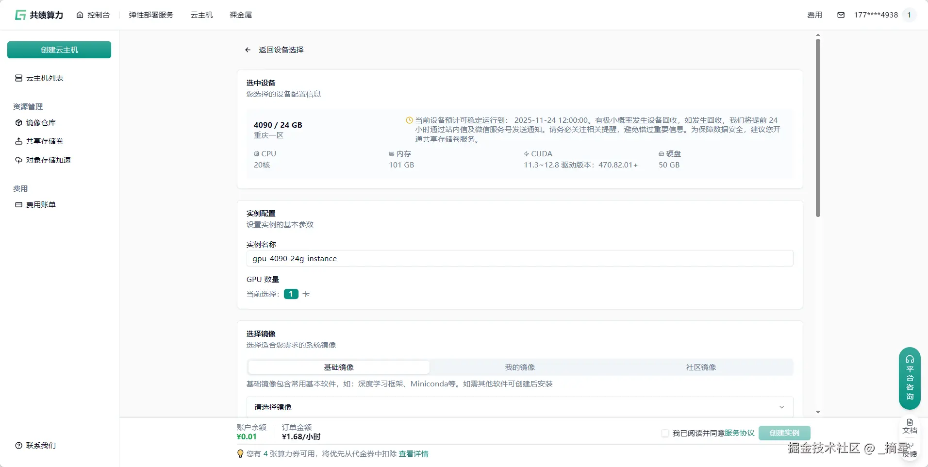 点击创建实例之后,共绩算力就会在后台自动为我们创建刚刚选好的云主机