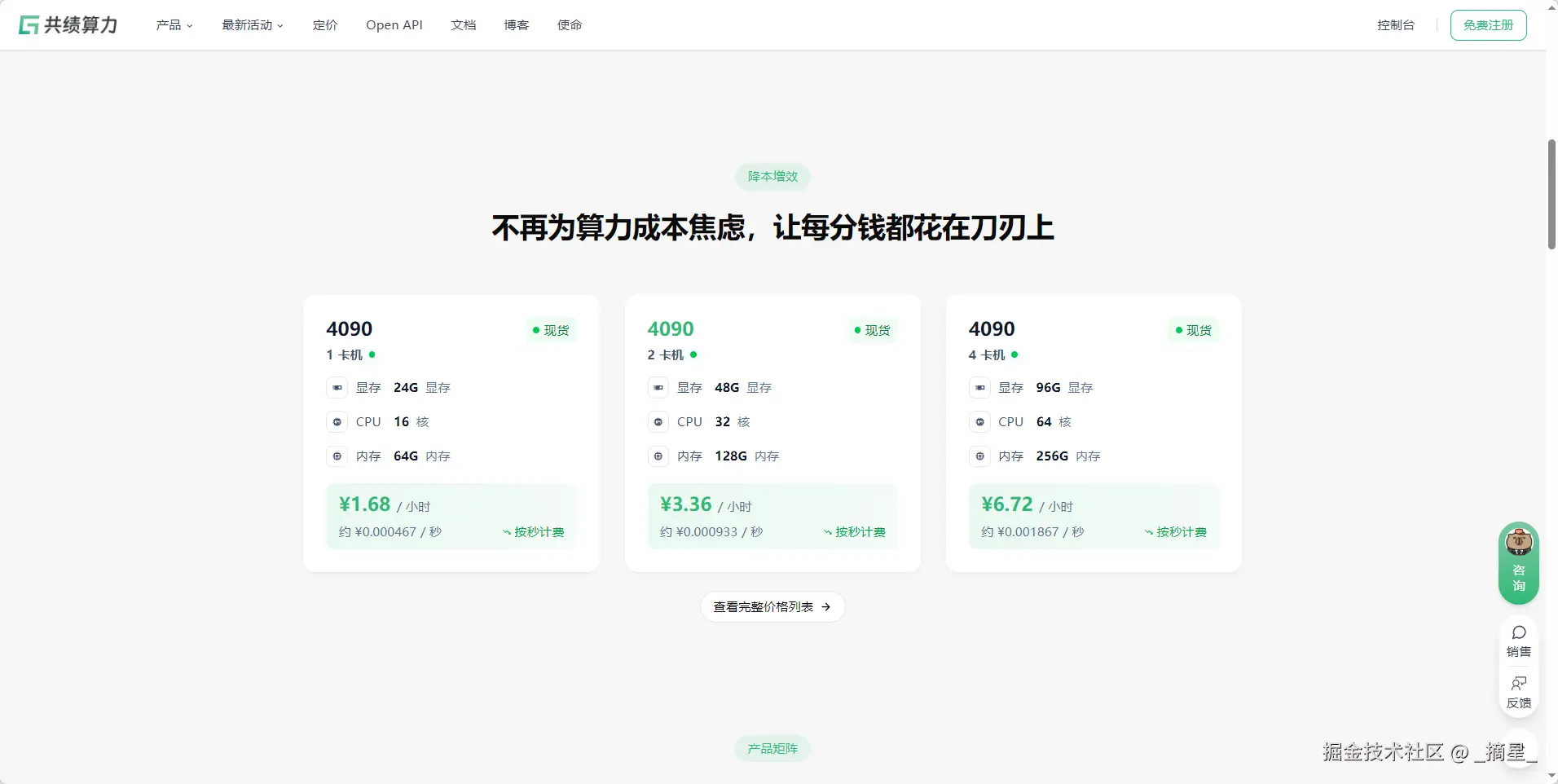 共绩算力平台的核心优势之一在于其极具竞争力的价格体系,真正实现了“降本增效”,让每一分钱都花在刀刃上。与传统云服务商动辄数十元甚至上百元每小时的GPU算力相比,共绩平台提供的4090显卡算力价格低至1.68元/小时(单卡) ,双卡配置仅需3.36元/小时,四卡集群也仅为6.72元/小时。这种按秒计费的精细化模式,意味着用户只需为实际使用的每一秒付费,避免了传统按小时计费带来的资源浪费和成本冗余。