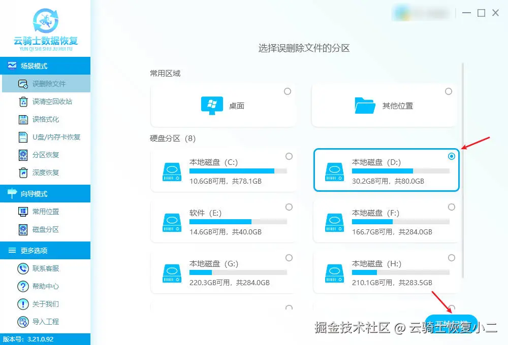 以专业的云骑士数据恢复软件为例,前往官网下载软件,并将软件安装到另一个硬盘分区,而不是文件丢失的分区。如果文件在D盘丢失,就安装到E盘等其他磁盘。