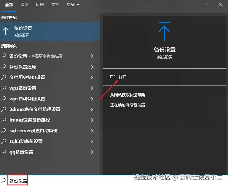 在Windows搜索框输入“备份设置”,进入后查看是否有之前的系统备份,可以从备份中提取文件。