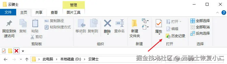 在文件原本所在的文件夹中,点击顶部菜单的“主页” -> “历史记录”。