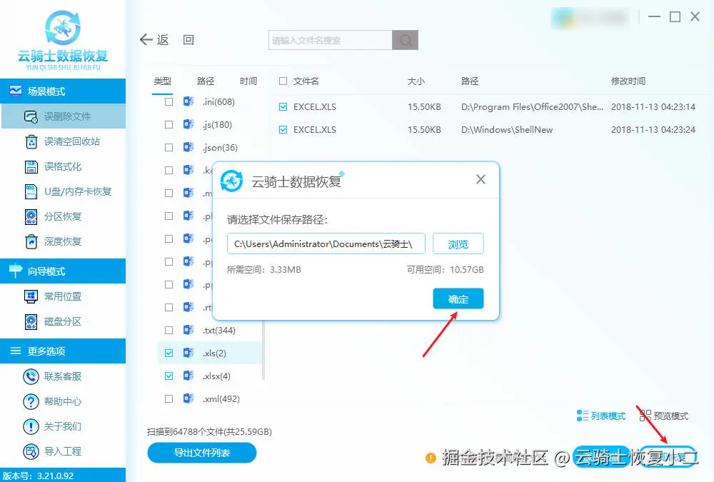 扫描完成后,通常可以按文件类型(如选择“文档”下的 .xlsx,.xls)或路径来筛选。然后利用“预览”功能预览Excel文件内容。