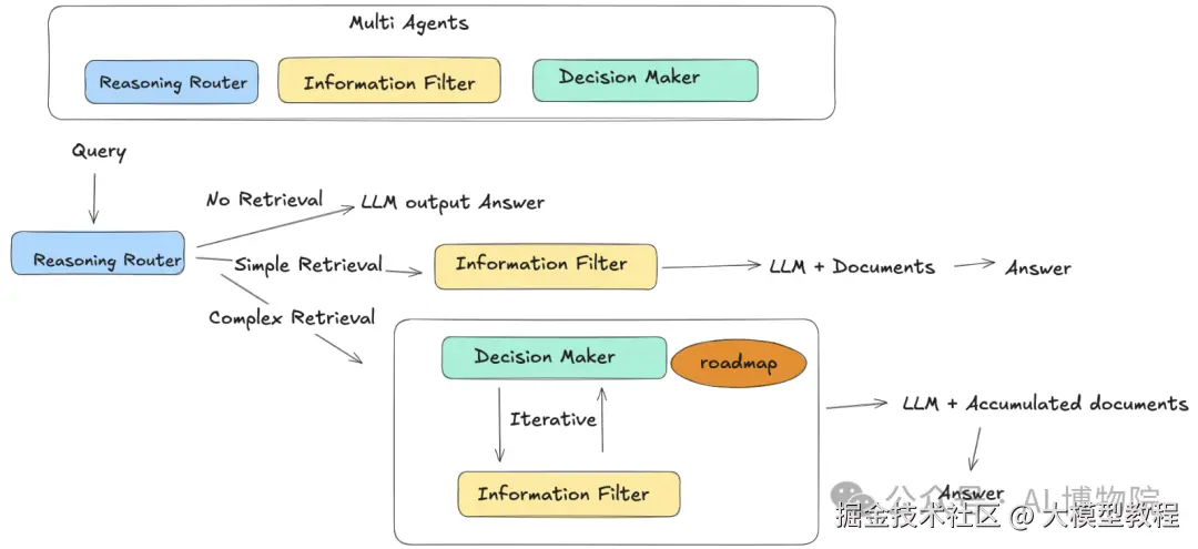 - 迭代检索与过滤(Iterative Retrieval and Filtering) :根据生成的路线图,智能体通过多次检索-过滤循环逐步收集相关信息。每次循环中,推理路由器确定当前子目标是否需要检索,信息过滤器提取相关文档,决策制定者评估进展并决定下一步操作。