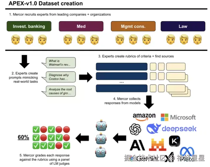 APEX 是由 Mercor 研究团队联合哈佛大学法学院、斯克里普斯研究所首次发布的一个用于评估前沿人工智能模型在高经济价值知识工作中表现的综合性基准测试数据集,旨在衡量前沿人工智能模型在真实经济任务中的执行能力,而非仅停留于抽象推理层面。