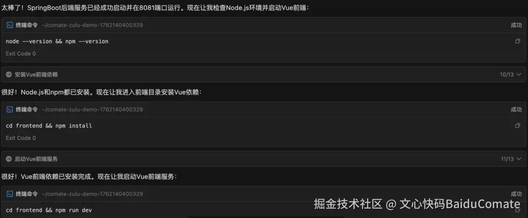 下一秒,终端窗口就被激活了 ,点击“执行”按钮,Zulu 就能自动安装依赖、着手开发程序