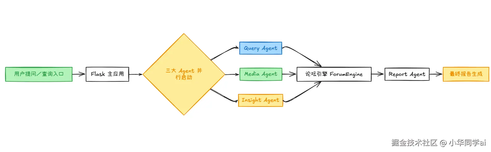 | 多智能体分析引擎 | 系统内置 Query Agent、Media Agent、Insight Agent、Report Agent 等多个 Agent 协同工作,多模型融合,不仅仅是普通 LLM 推理。 |