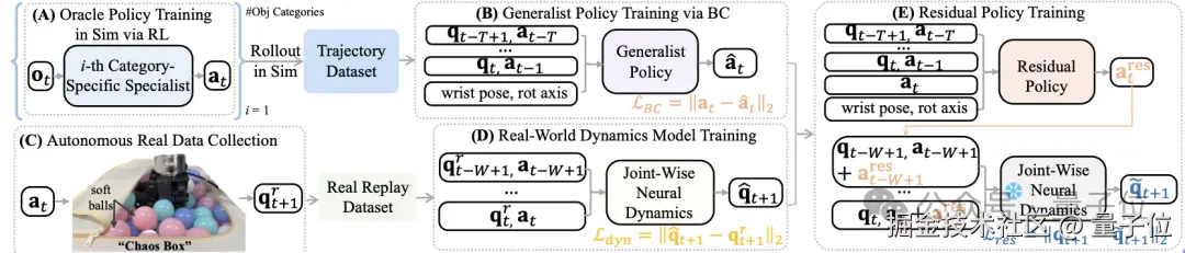 基于此,研究者进一步训练了一个残差策略网络,用于弥合仿真到现实的差距,使仿真中学到的基础策略能够顺利迁移到真实世界。