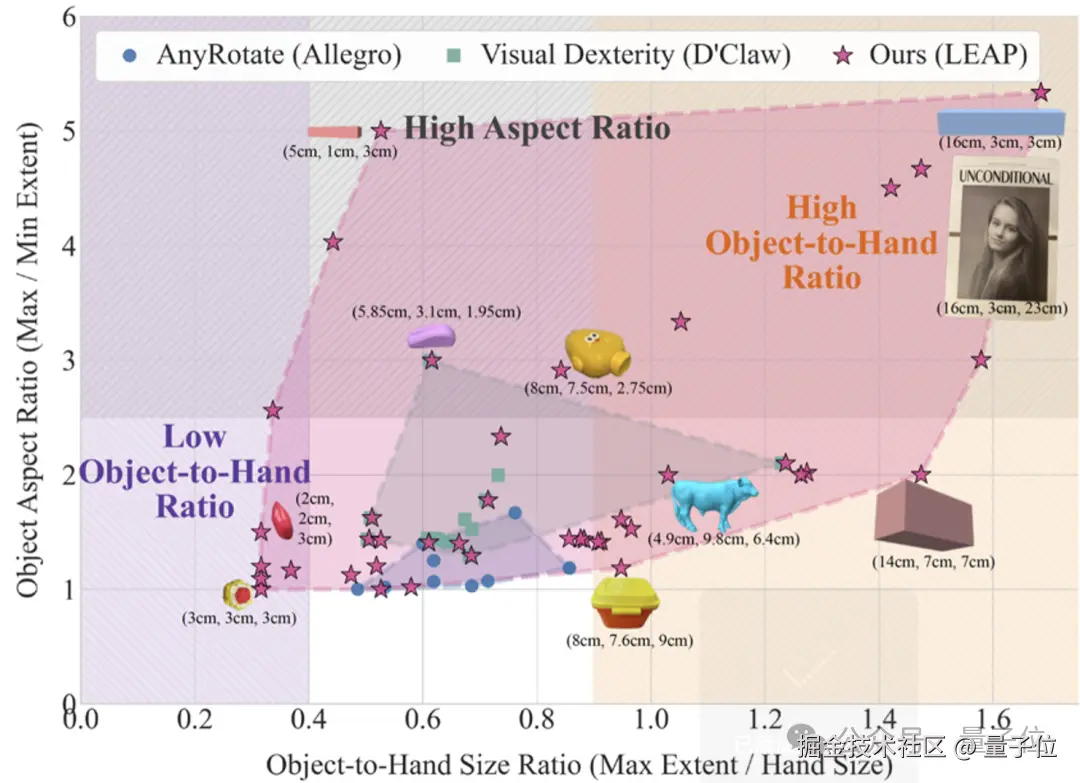 在这些方法中,我们可以窥见,当前的手内操作方法往往局限于特定场景(如固定手腕朝向)、只能处理有限集合的常规物体,或依赖昂贵、定制化硬件。即便在单一维度(如旋转轴)上实现了通用性,仍难以在多维操作中保持稳定表现。