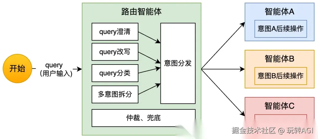 分发的前提要先完成用户意图的理解。即需要分析用户的输入代表什么意图,综合考虑上下文信息包括前序交互内容、当前环境感知及状态信息。进而做出动态决策,把请求导流到不同的专门处理流程。只有准确的意图理解才能做到精准分发。