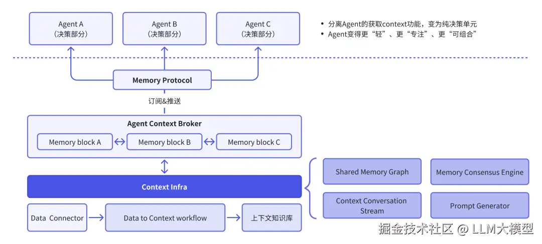 在常见的 Agent 架构设计中,每个 Agent 是一个数据孤岛(虽然已有 Agent 之间的通信协议),维护自己的context,独立获取(如环境数据、用户状态),导致重复计算和版本冲突。