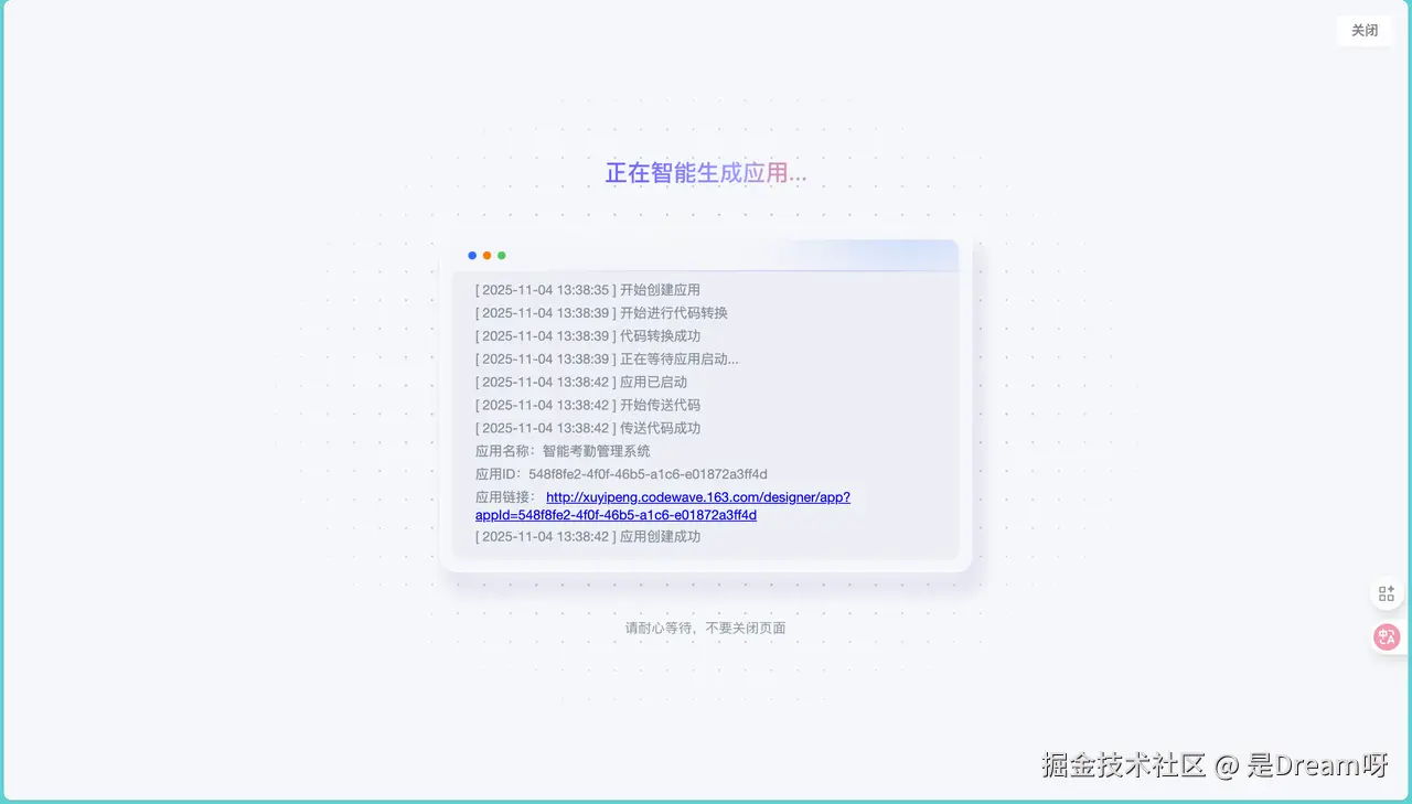 点击图中的链接,便可以又回到CodeWave可视化开发界⾯ ,点击右上角关闭 ,可以回到应⽤⽣成的聊天界⾯。