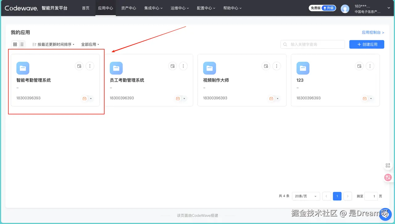 注册完毕之后,我们会直接进入到平台的页面中,然后需要我们去点击顶部导航栏的"创建应用"按钮: