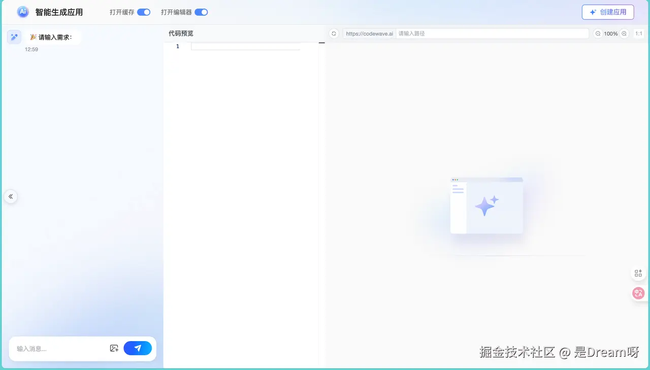 在创建应用页面点击"智能生成应用"按钮,系统将跳转到智能生成向导界面。该界面采用左中右分栏设计,左侧为需求输入区,中间是代码生成区域,右侧为实时预览区,方便开发者边输入边查看系统的理解情况。