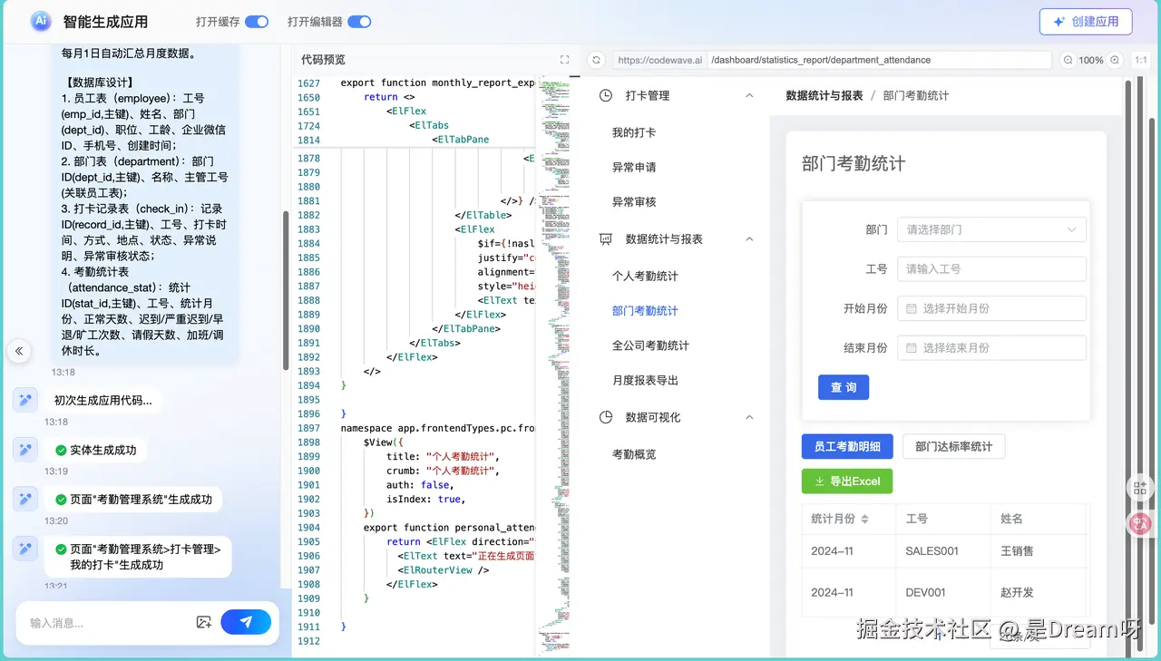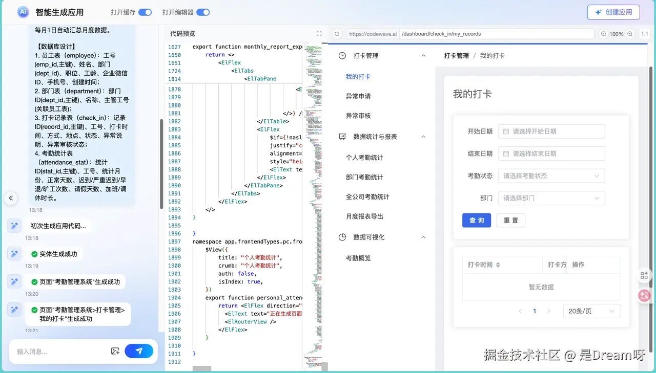 而在本次实践中,我们选择了网易 CodeWave 智能生成应用,面对“多场景打卡、多角色权限、数据可视化”等复杂需求,仅通过结构化的自然语言描述,CodeWave 即在 2 分钟内 完成了从代码生成到界面呈现的全过程。 与传统前后端协作模式相比,大幅提升开发效率。通过自然语言交互和对话式迭代,我们可以将更多精力投入到业务逻辑的思考上,而非繁琐的代码编写工作中。