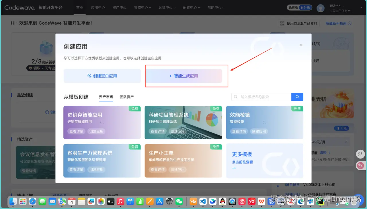 在创建应用界面处,选择我们的智能生成应用,如果未看到该选项,可能需要联系平台小助手进行功能开通: