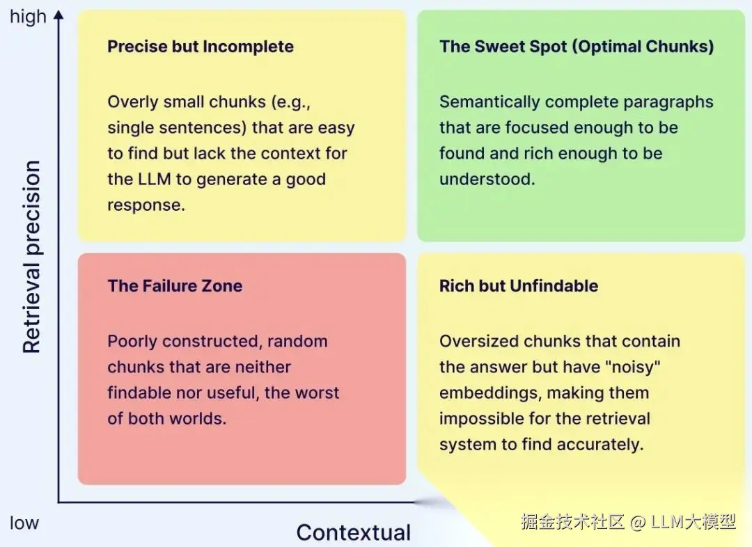 目标是找到"分块最佳点"——创建足够小以实现精确检索但足够完整以给LLM所需完整上下文的块。