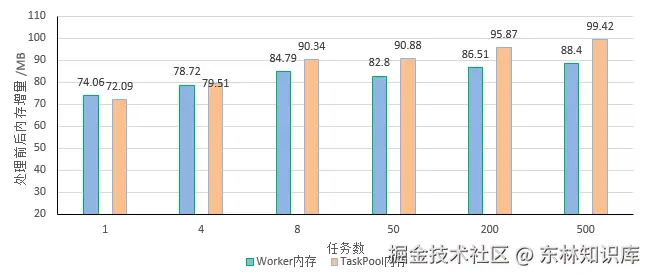 这是由于TaskPool在Worker之上做了更多场景化封装,TaskPool实现了调度器和Worker线程池,随着任务数的增多,运行时会多占用一些内存空间,待任务执行完毕之后都会进行回收和释放。